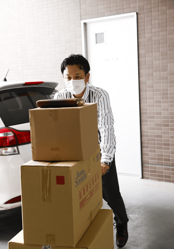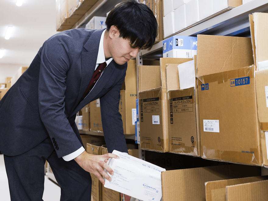 納品する商品を社内の倉庫で準備。「○○病院は注射針の種類が多いから特に注意しよう」「□□クリニックからは昨日、追加のサンプル依頼があったな」など、お客様ごとに、納品書と商品を揃えていきます。
