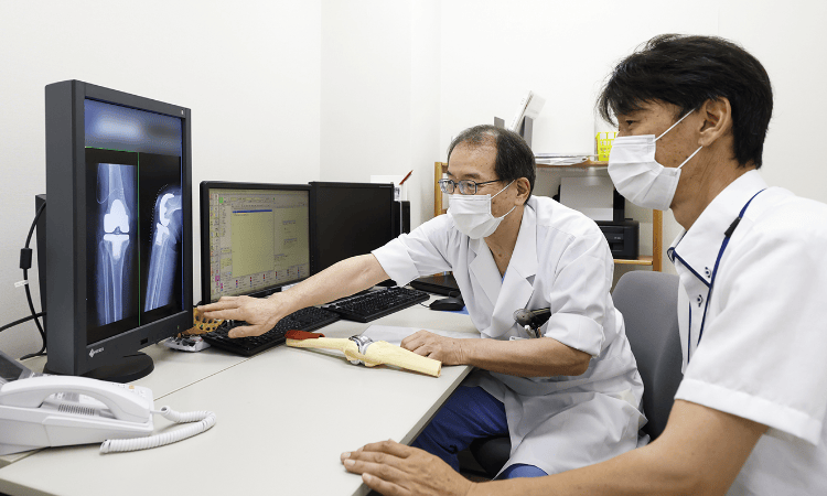 レントゲン画像を見ながらドクターと術前計画を協議。「この症例なら〇〇社の製品が最適です」と具体的に会話するなど、さながらドクターの右腕のよう。